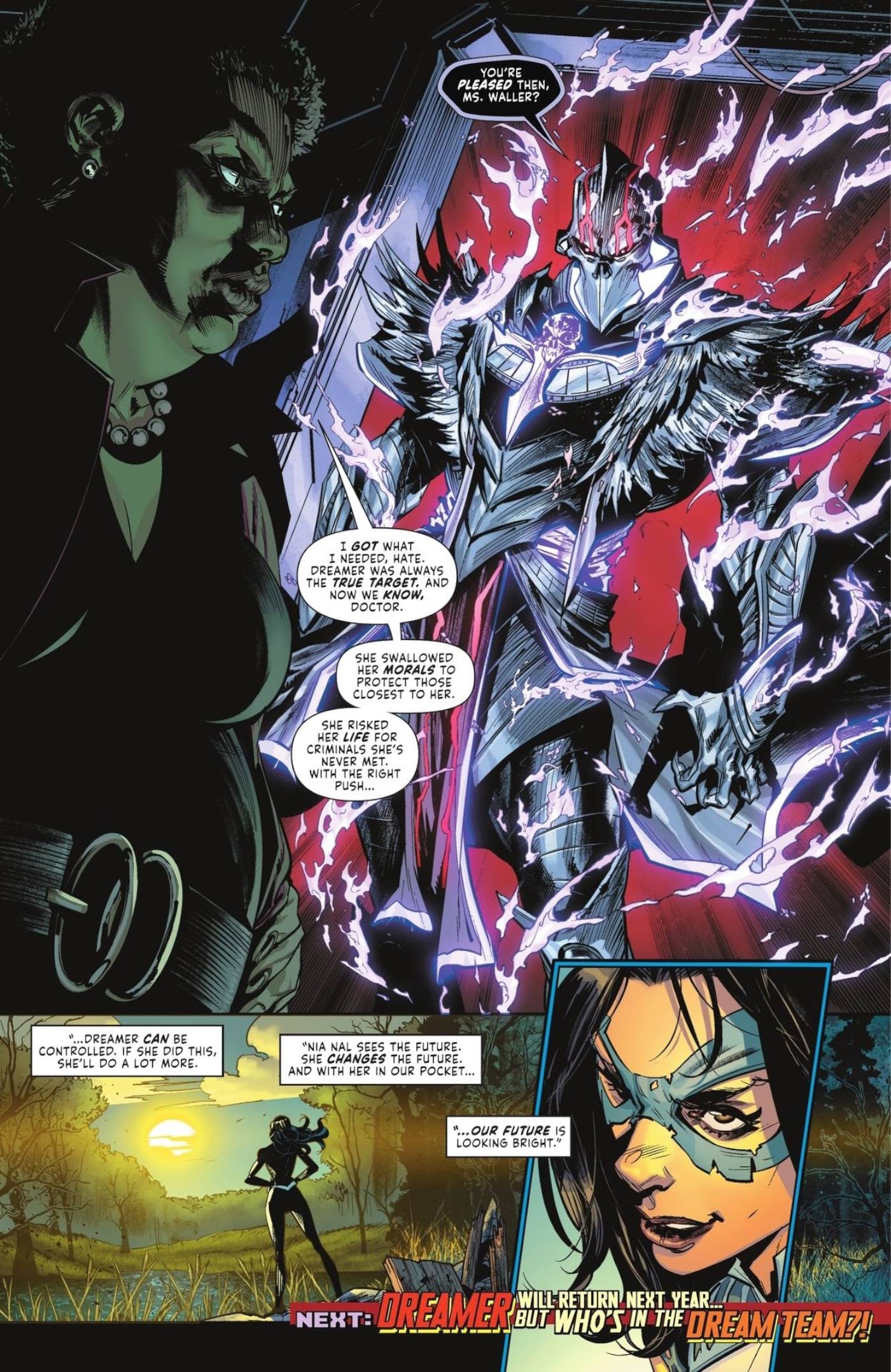 Waller, orchestrating events to eliminate superheroes and secure Earth’s future for humanity, views Dreamer as a potential asset. Believing Dreamer’s powers can be manipulated to serve her cause, Waller sees an opportunity to enhance her own influence. If successful, Dreamer’s precognition combined with Waller’s strategic brilliance could make Amanda Waller an unstoppable force.